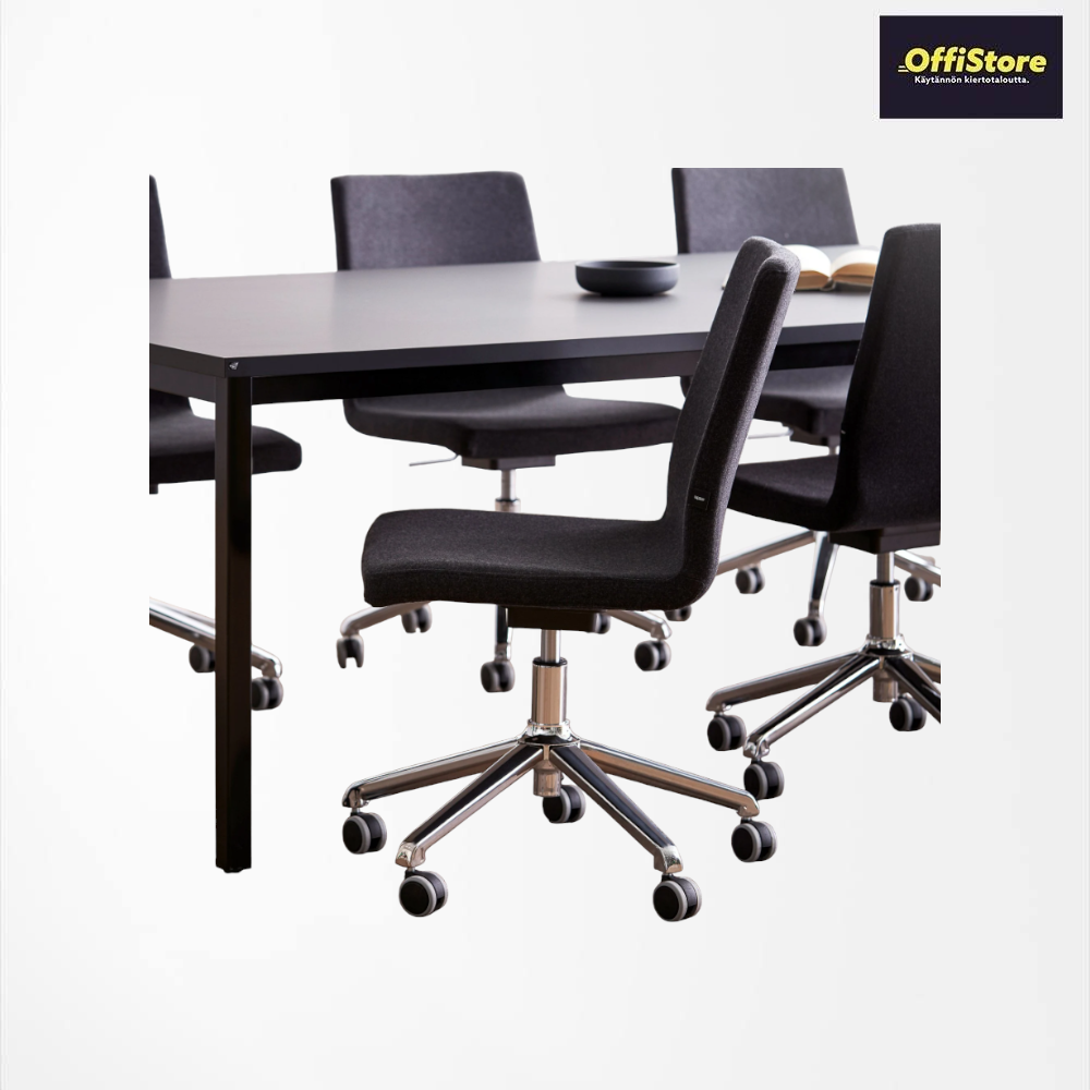Pyörällinen, kevyesti rullaava neuvottelutuoli on hyvä valinta neuvotteluhuoneeseen. Tuolin ominaisuuksien ansiosta siinä istuu mukavasti myös pitkässä kokouksessa.